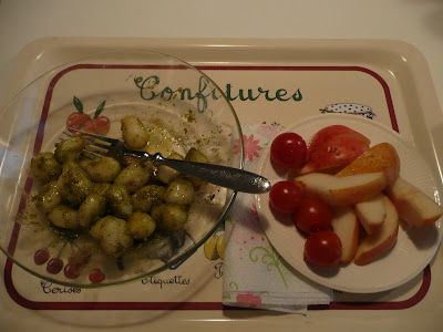 The penultimate pot of pesto (from summer 2009) went on my potato gnocchi. The pears were juicy; the tomatoes so-so.