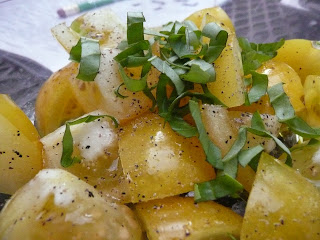 It's summer: warm and humid! Time for a tomato salad with the basil that is now growing in the garden. A little olive oil and black pepper -