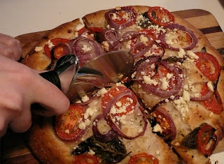 makes a tasty focaccia with tomatoes, onions, and basil. We added a little feta before we heated it in a 350 oven.