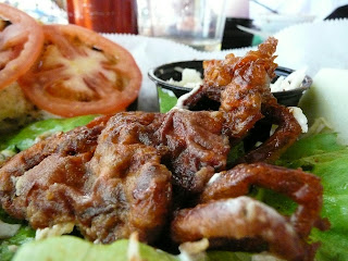 A sunny, warm late spring evening at Minnehaha Falls. We arrived at Sea Salt Eatery before the crowds (that means before 6PM!). You don't really need the bun on the soft shell crab sandwich. The fried crabs drizzled with a bit of sauce and the cole slaw are enough. Washed it down with a very dry Spanish Reborado - was that the name of it? That really hit the spot.